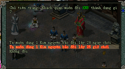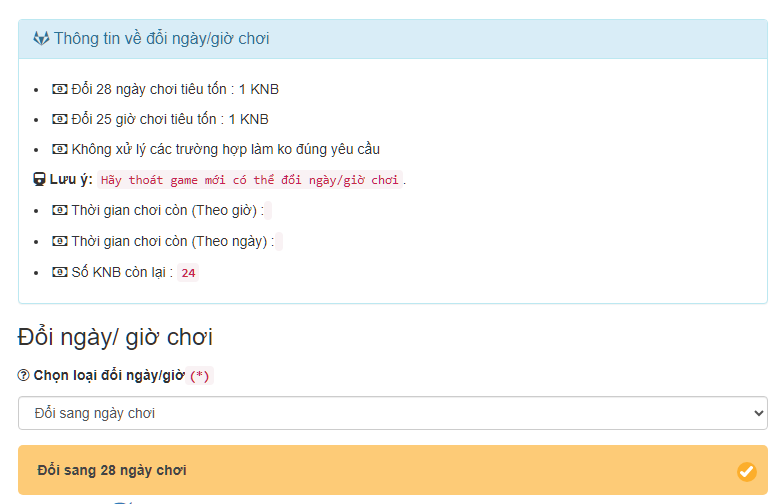 - 1 Kim Nguyên Bảo có thể đổi 28 ngày chơi hoặc 25h chơi